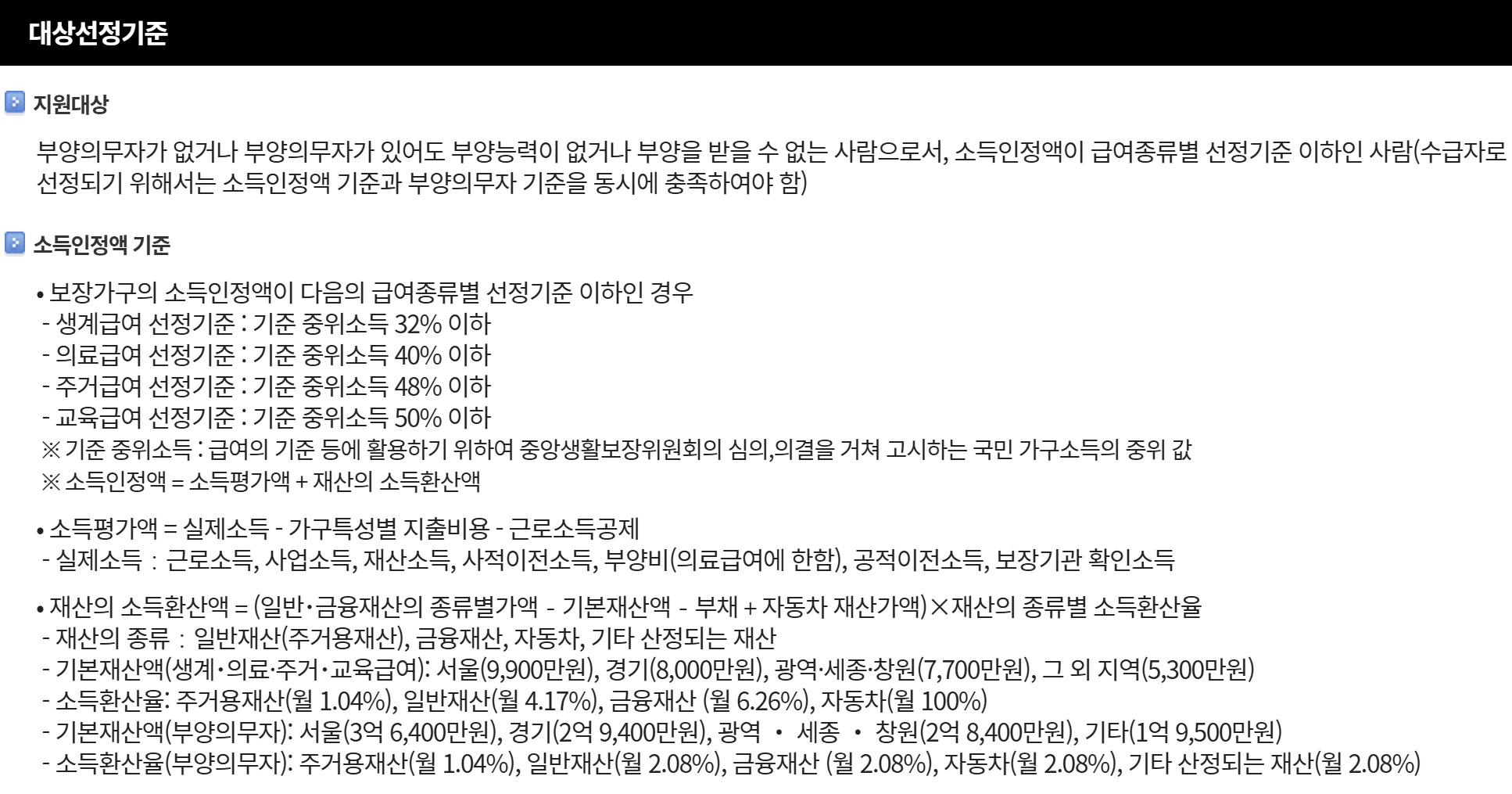 의료비, 주거급여, 공공요금 등 전반적인 지원을 받게되고